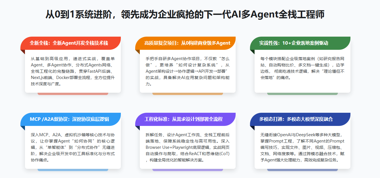 多/通用型Agent开发是热门、高薪就业方向,也是构建核心竞争力的优选。但多数课仅停留在工具调用和简单案例层面,难以满足企业对深度融合AI解决复杂问题的人才需求。本课直击这一痛点,带你从0到1,从单/多Agent、分布式架构,再到全栈工程化,助你从程序思维升级到系统思维。通过复刻类Manus核心模块,深入掌握MCP、A2A、COT、多模态,及任务规划、分布式调度等核心能力,成为企业急需AI多Agent全栈工程师。