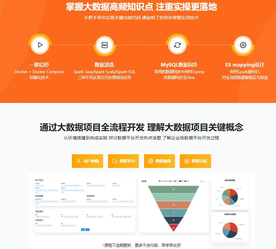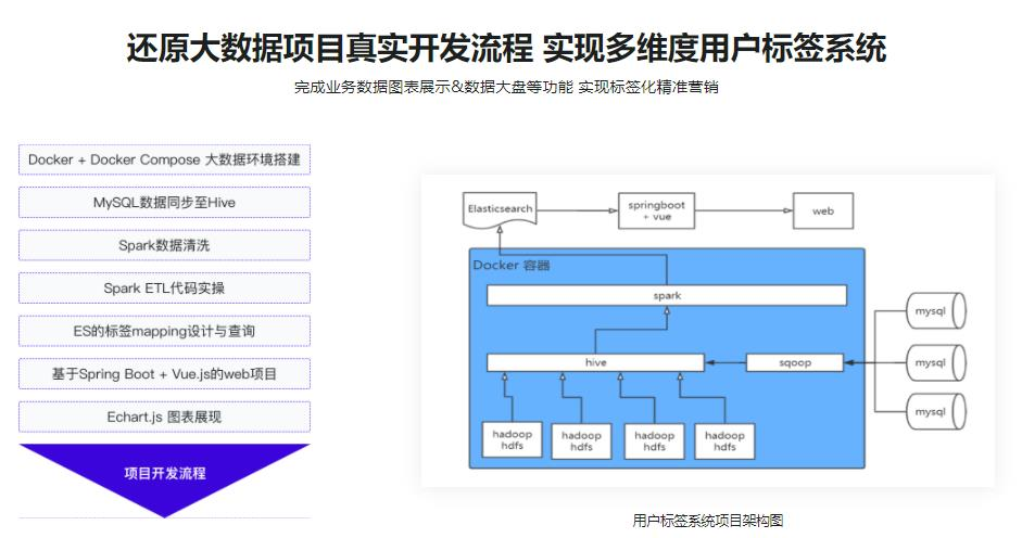 课程利用 Spark + ElasticSearch 构建用户标签系统,利用 Docker+Docker Compose 实现项目的一键启停。涵盖数据同步、数据清洗、用户标签化等步骤,带你领略企业级数据平台的开发流程。